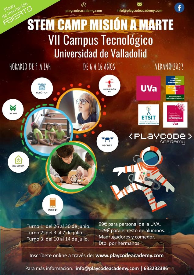 La Universidad de Valladolid, en sus Campus de Valladolid y Palencia, acoge por séptimo año el Campus Tecnológico de Verano, para jóvenes de 6 a 16 años, en su apuesta por el desarrollo de habilidades relacionadas con el lenguaje de la programación y las nuevas tecnologías. Play Code Academy organiza la actividad en colaboración del Parque Científico de la UVa, la Escuela de Ingeniería Informática, la ETS de Ingenieros de Telecomunicación y el Campus de Palencia.