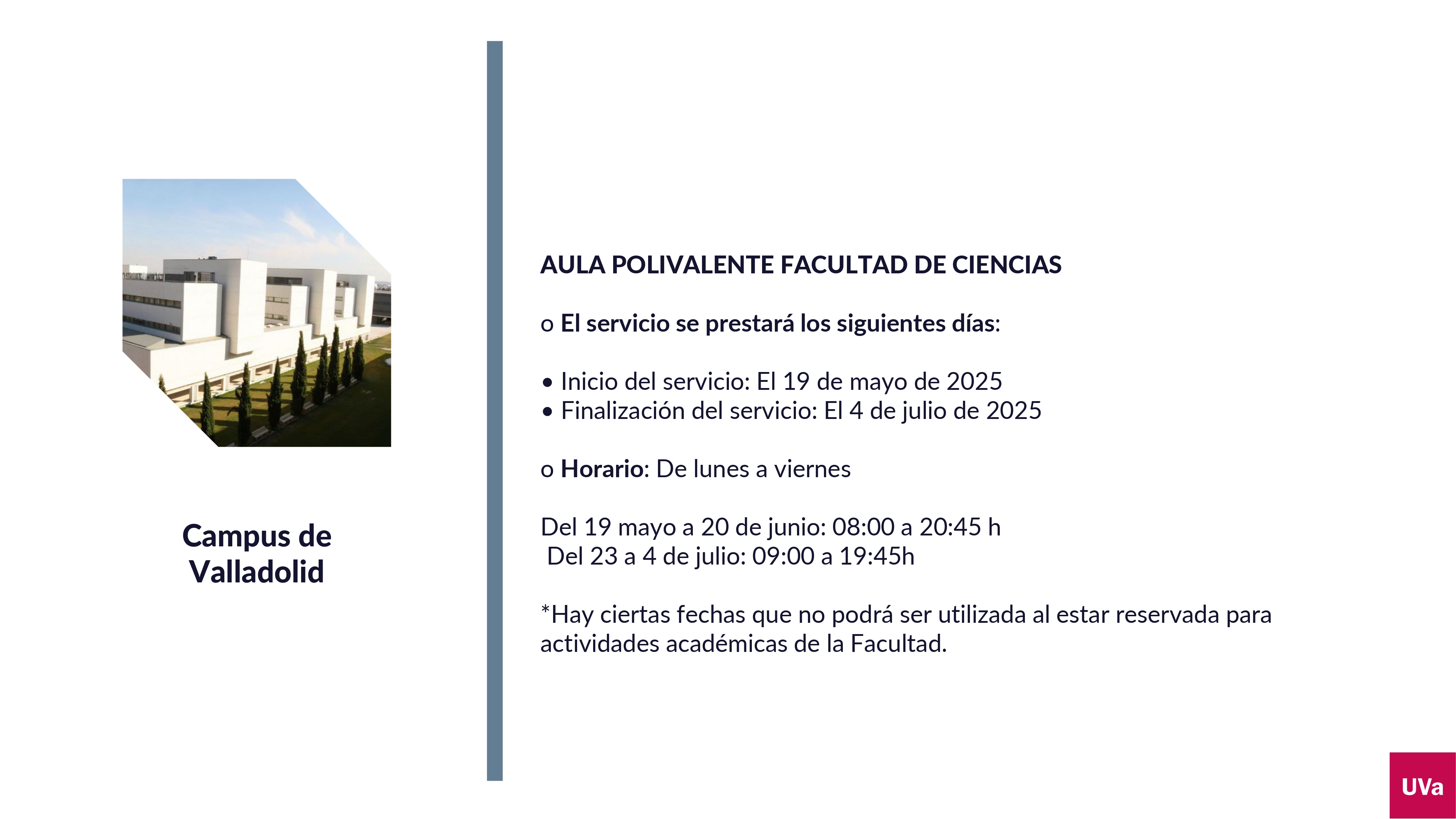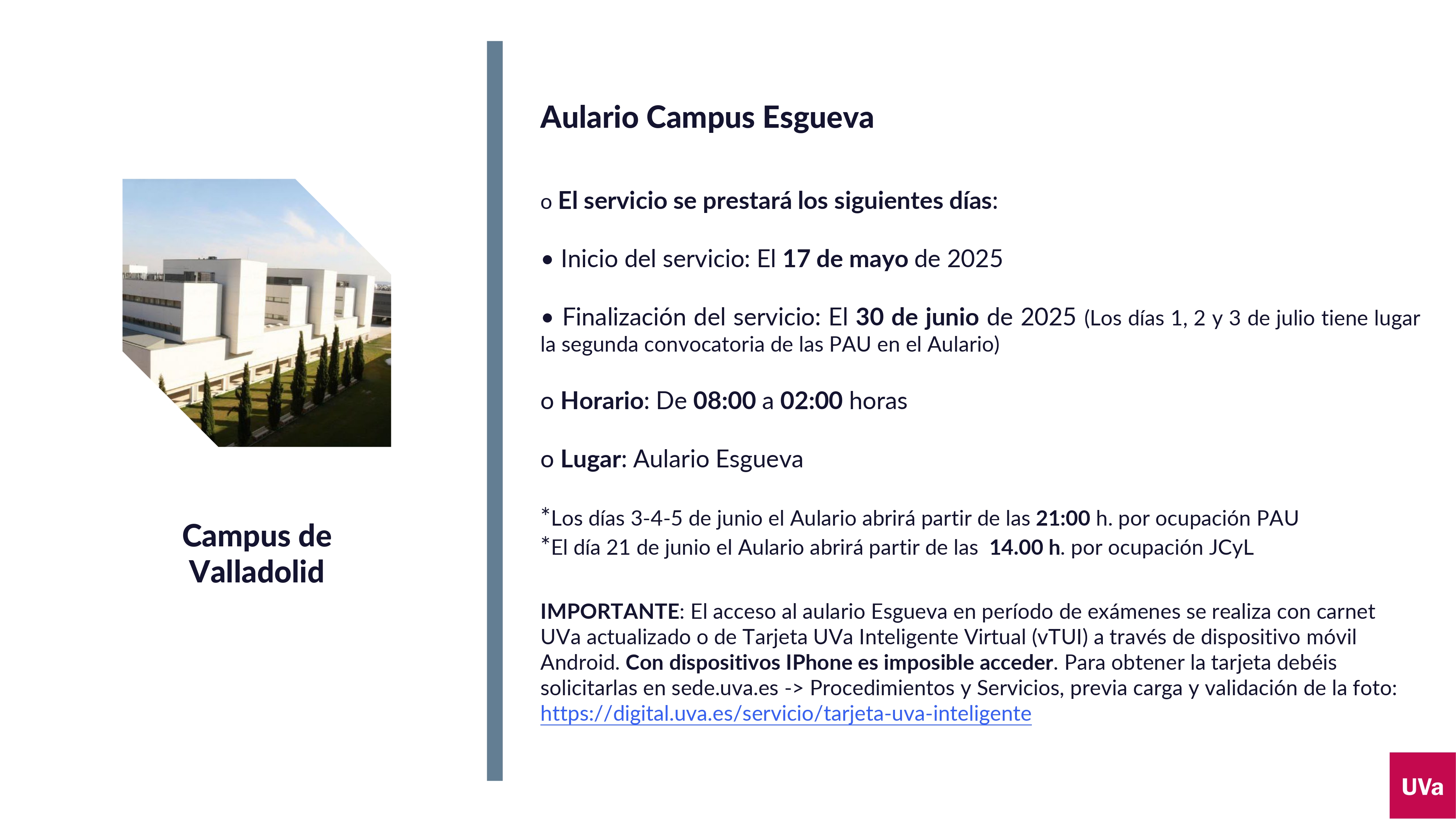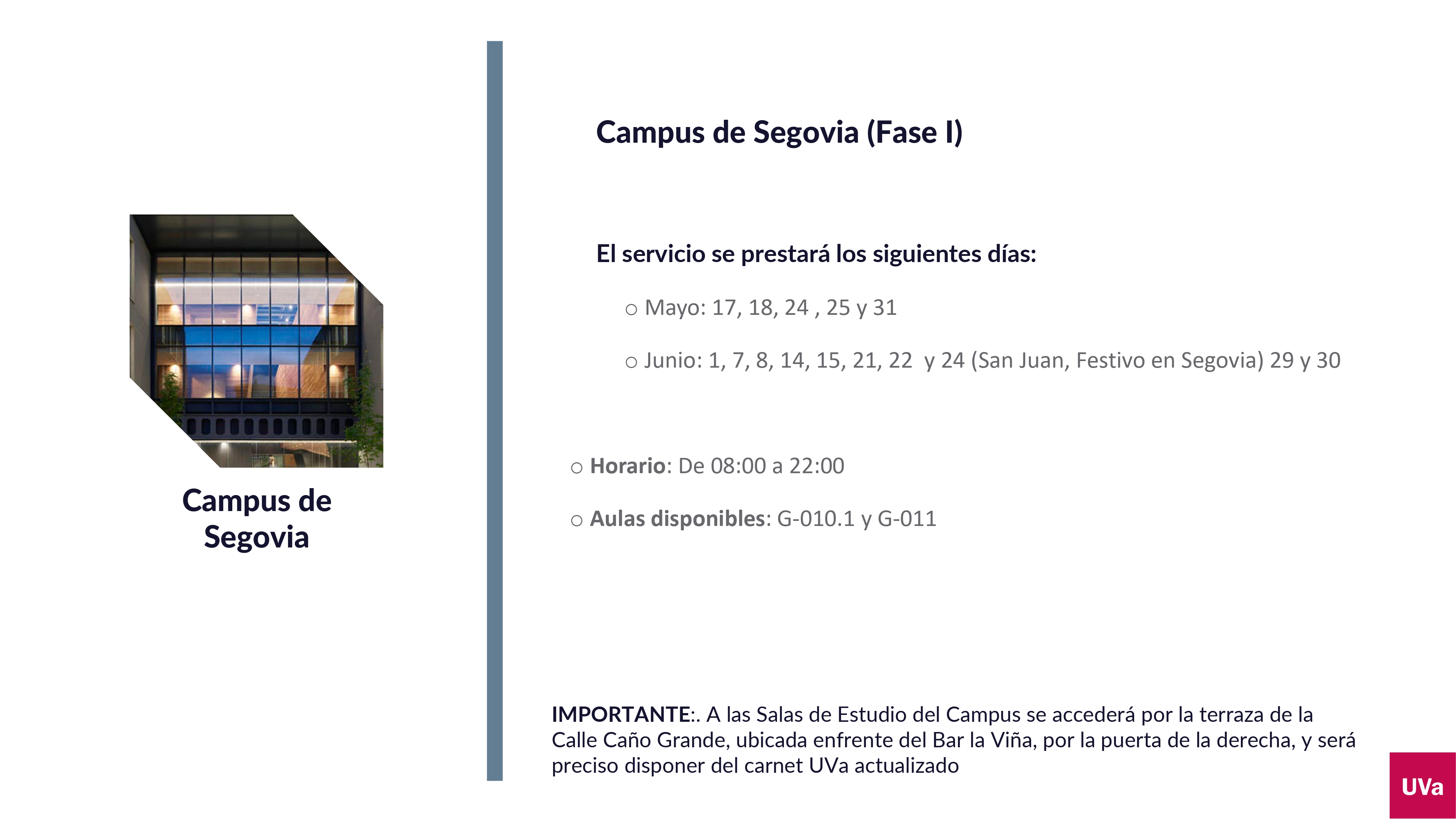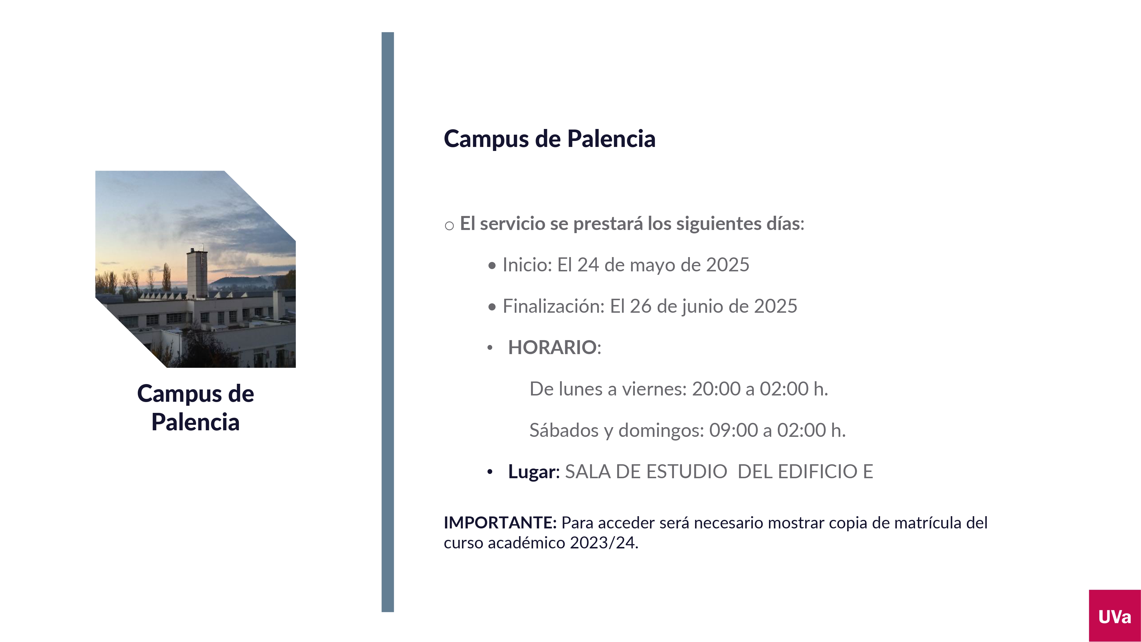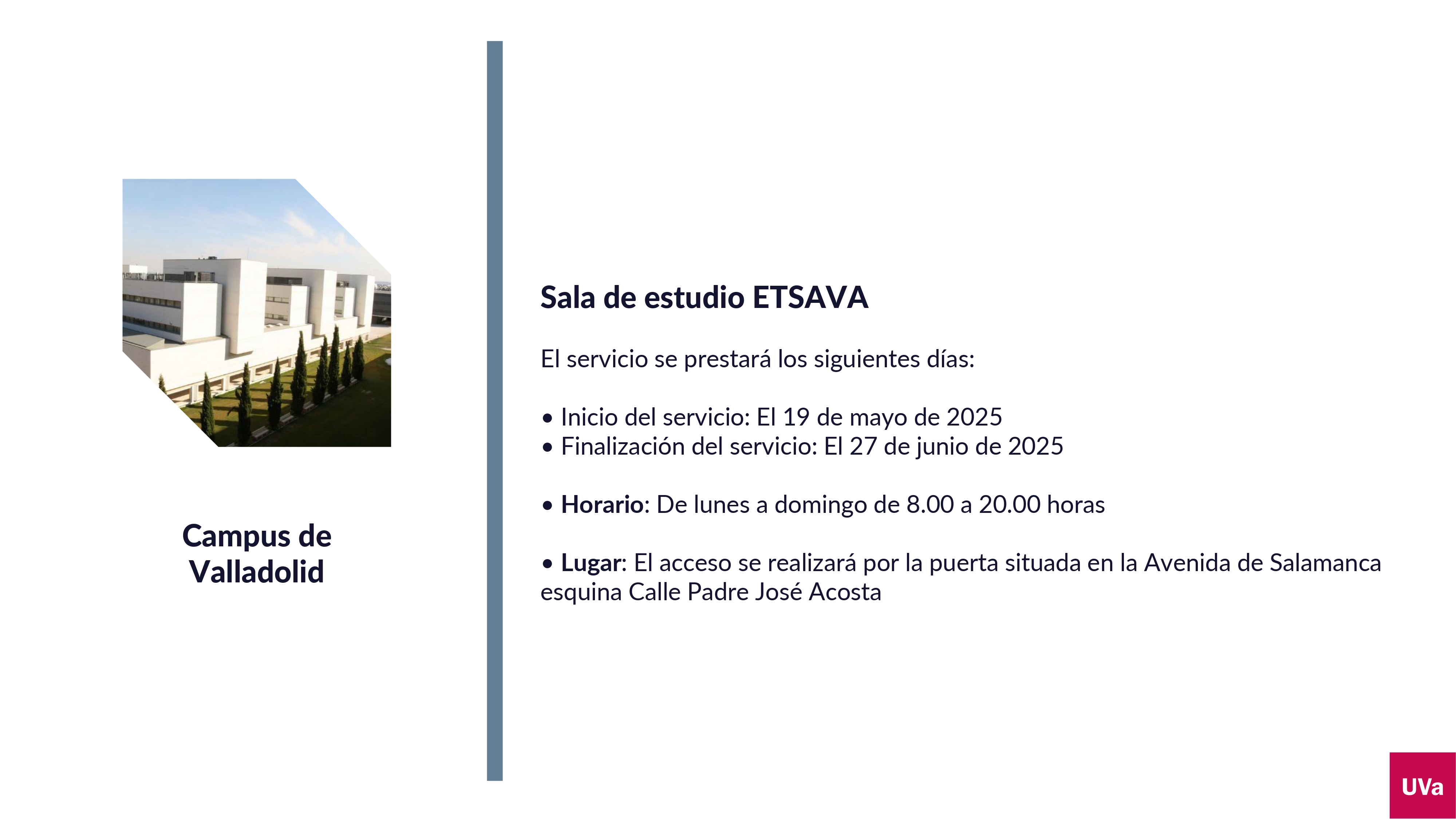 La UVa, a través de su Vicerrectorado de Estudiantes y Empleabilidad, amplía desde el próximo 17 de mayo los horarios de apertura de sus salas de estudio para favorecer la preparación de los exámenes del segundo cuatrimestre.