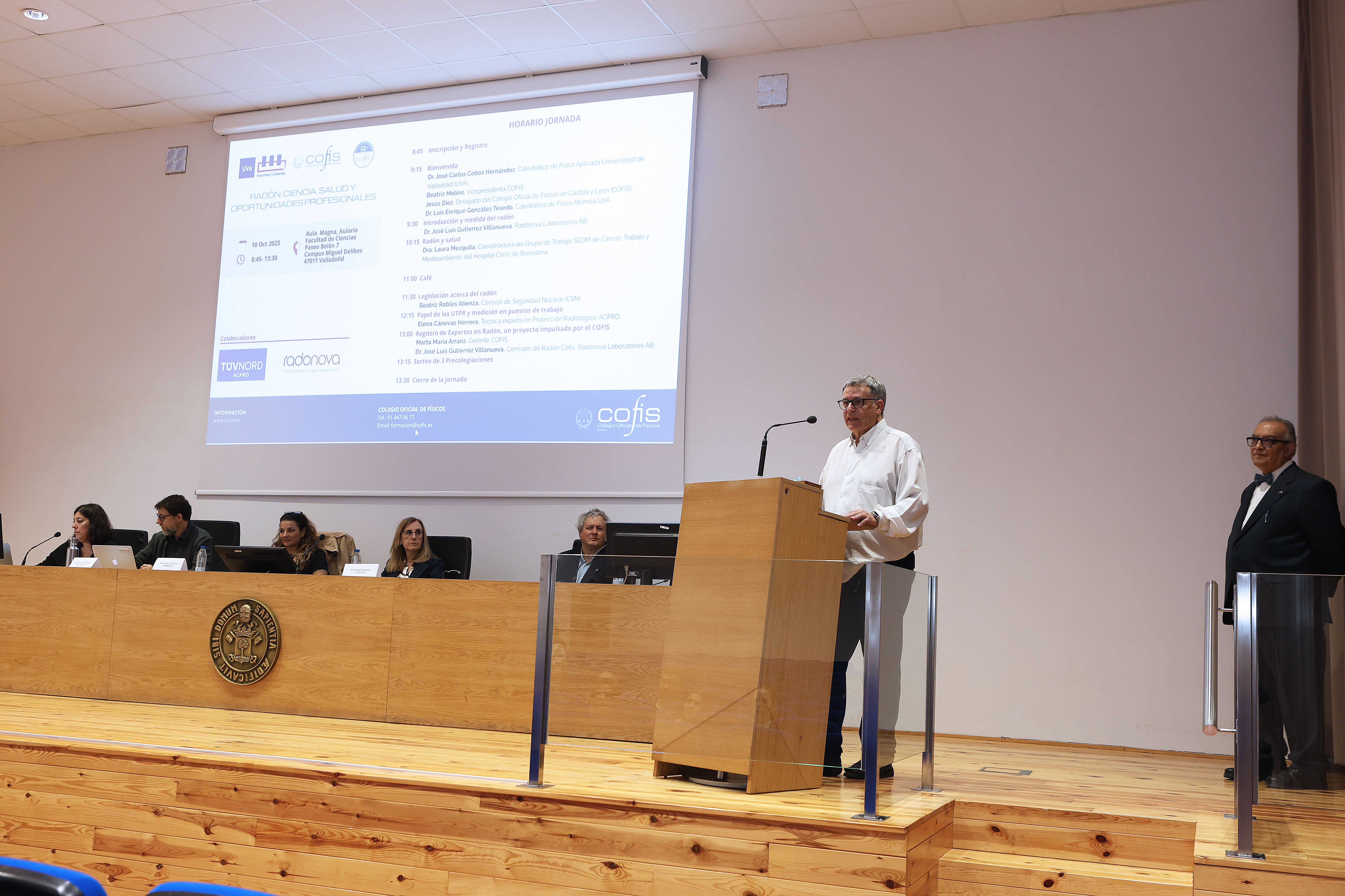 La jornada que se está celebrando hoy en la Facultad de Ciencias de la UVa reúne a estudiantes del Grado en Física y del Máster en Física, profesionales de la Protección Radiológica, empresas y consultoras del sector, técnicos en prevención de riesgos laborales (PRL), investigadores y divulgadores científicos. Aprovechando la presencia de todo este público el Colegio Oficial de Físicos (COFIS), coorganizador de la jornada, va a presentar el Registro de Expertos en Radón con el objetivo de captar nuevos expertos.